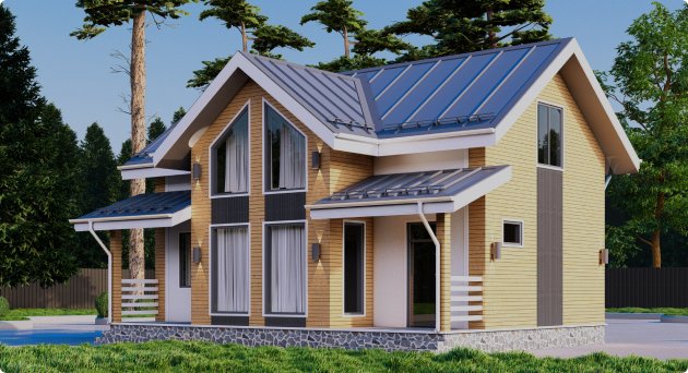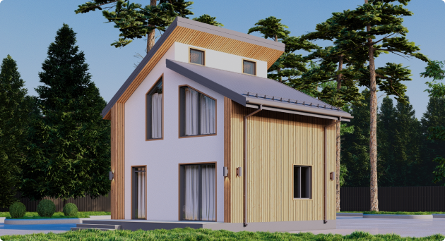 Проект PR-116 представляет собой двухэтажный дом, выполненный по каркасной технологии, с тремя спальнями, расположенными на чердаке. Эта архитектурная форма позволяет эффективно использовать пространство и создает уютную атмосферу.